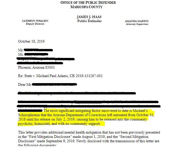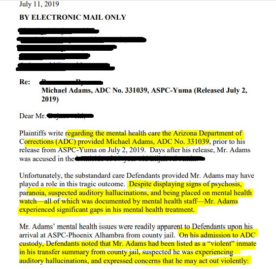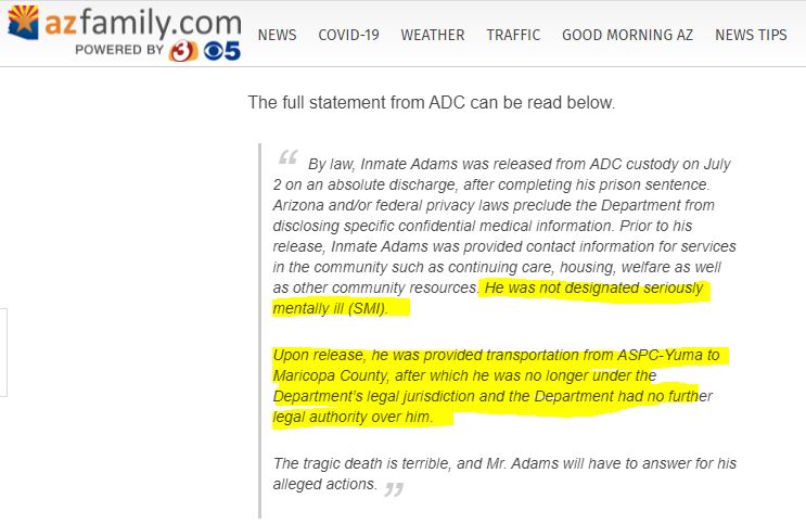 In this document, you will see one of many chilling facts surrounding the case, is that Michael Paul Adams had been designated SMI but was never treated by AZ DOC. They told the media and public that he (Michael) was not SMI, but they have countless documents within their own agency confirming he did. They, themselves documented him as DTO which means (Danger To Others).