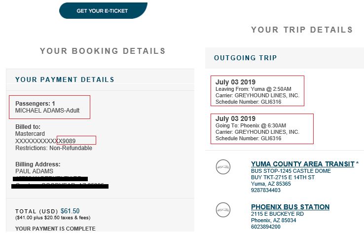 Arizona Department Of Corrections (AZDOC) indicated that they provided Michael a ride back to Maricopa County and that he was provided continuity of care. In my opinion, and as you can see by the bus ticket abstract below, this was an incorrect statement. Michael’s father paid for Michael to take a Greyhound bus back home. It is our understanding that the AZDOC released Michael to the streets a little after 3am in the morning on July 2nd, 2019. He had no money, no food, no way home and no mental medication for an unknown specified amount of time.